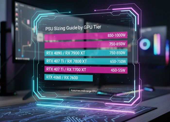 High-end builds with RTX 4080 or 4090 cards need serious power. The 4090 alone can spike to 450 watts. Factor in a power-hungry CPU and you’re looking at 750-850 watt PSU minimum. Always add 150-200 watts above your calculated maximum draw for safety margin.